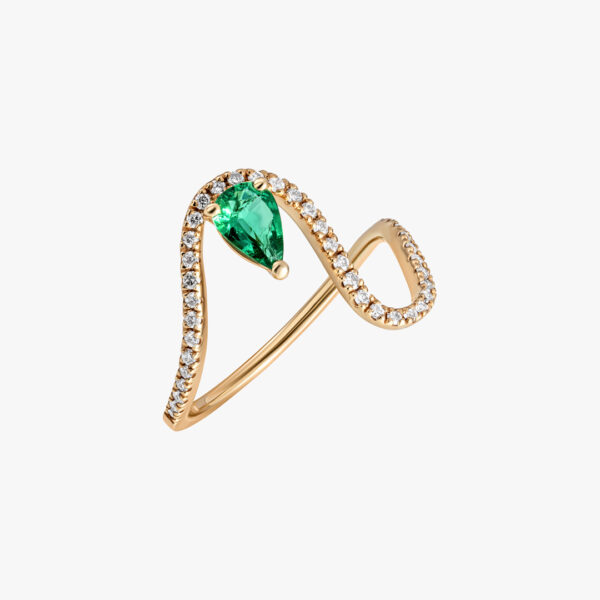 This exquisite wavy ring, crafted from luxurious 18k yellow gold, blends artistry with elegance. Adorned with 0.20 carats of sparkling diamonds and a striking 0.92-carat emerald, it captivates with its unique wave design and vibrant color.