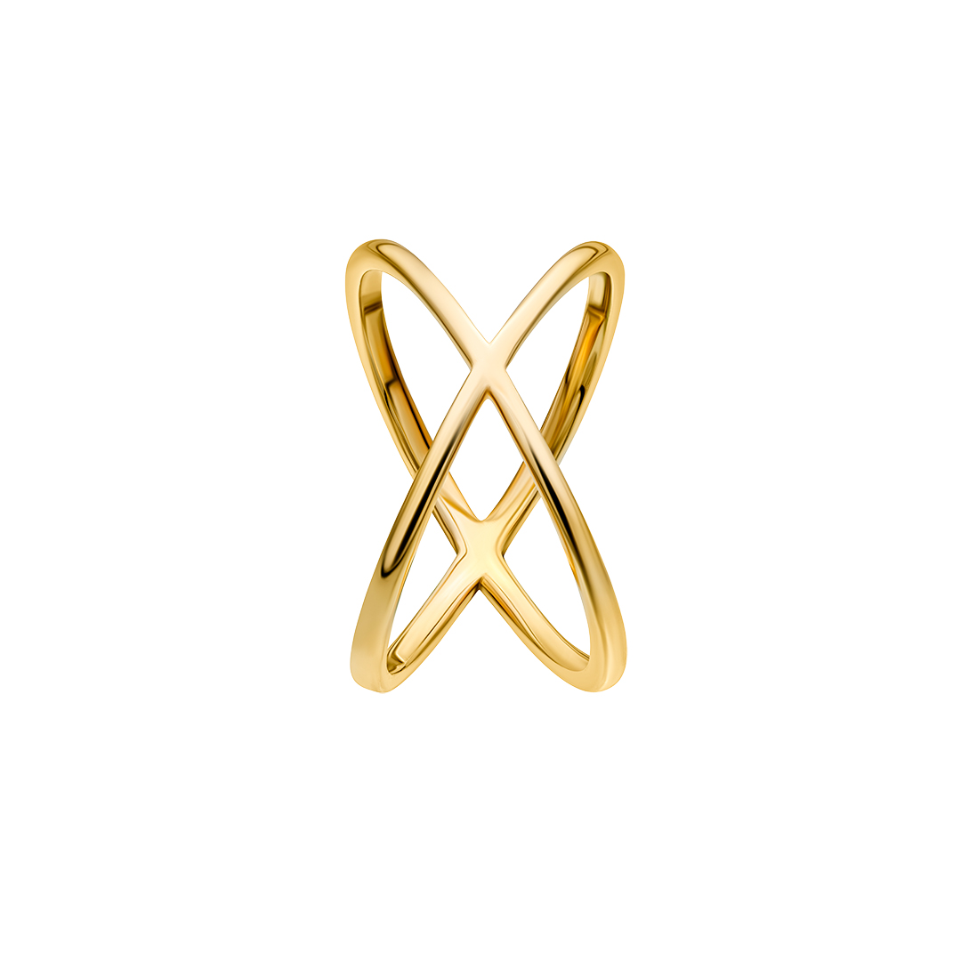 An open 18k yellow gold ring featuring a sleek, crisscross design. A modern yet minimal piece, perfect for everyday elegance or special occasions.